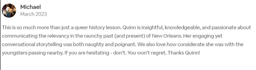 Join a 2 hour deep dive into the history of Queer New Orleans covering everything from lesbian madams running queer performance brothels to the world famous drag clubs running illegally in the 1940’s to the rise of the French Quarter gay community. Learn the ways the Queer community of New Orleans shaped the history of nightlife in ways that changed the entire world. With equal commitments to comedy and historical accuracy- and over 900 5 star reviews-the tour is unmissable for any queer person touring our wild and wonderful city.